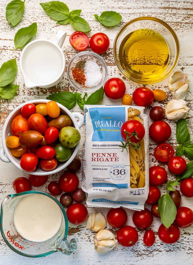 Le Penne alla Vodka con pomodoro fresco e basilico sono ricche, cremose e così saporite! La salsa alla vodka è fatta con olio d’oliva, una generosa quantità di pomodorini freschi, abbondante aglio e solo un tocco di fiocchi di peperoncino tritato – oltre a vodka, panna e tonnellate di basilico fresco! Questa ricetta di penne alla vodka di qualità da ristorante diventerà sicuramente una delle preferite in famiglia!