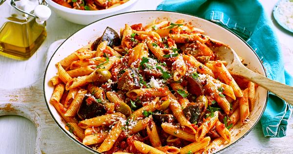Una volta sbucciate le melanzane, tagliatele a fette non troppo sottili (1 cm va bene) e fatele cuocere in abbondante acqua non salata. A metà cottura cambiate l’acqua e aggiungete due cucchiai d’olio. Quando le melanzane sono pronte, scolatele e tenetele al caldo. Nell’acqua di cottura delle melanzane lessate la pasta al dente (che provvederete a salare). Scaldate a parte il resto dell’olio con gli spicchi d’aglio tritati o interi schiacciati che alla fine toglierete, e aggiungete una presa di pepe fresco. Mettete nella zuppiera la pasta e le melanzane, condite con l’olio caldo e abbondante parmigiano reggiano grattugiato. Servite subito.