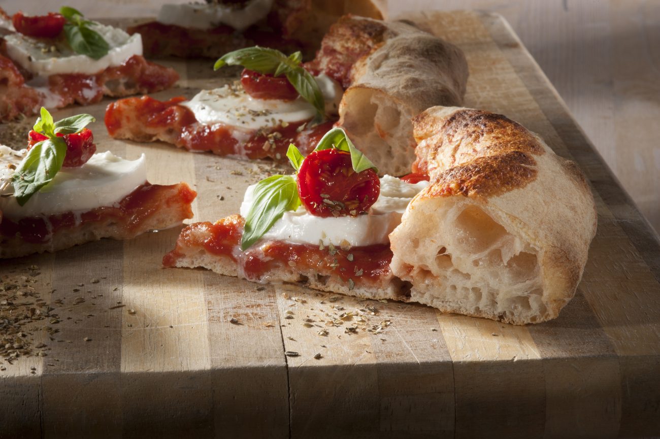 Dopo aver inserito tutta l’acqua all’interno dell’impastatrice a spirale e aver sciolto metà del nostro lievito, impostarne la velocità a livello 1. Introduciamo metà della farina lasciando che si impasti fino a quando i grumoli della farina a contatto con l’acqua si siano ben sciolti e quindi spegnere l’impastatrice lasciando al suo interno il tutto. Dopo 12 ore, introduciamo il restante metà del lievito, il resto della farina, tutto il sale e tutto l’olio di oliva. L’impasto formatosi all’interno dell’impastatrice a spirale, risulterà pronto dopo circa 10-15 minuti, porlo sul banco, e formare pagnotte di peso 1,2-1,4 kg, e lasciarle riposare per circa 10-15 minuti, coperte in maniera che non si formi crosta in superficie. Dopo il riposo, stendere l’impasto in maniera uniforme in teglia 40×60 (misure standard), condirlo a proprio piacimento, e dopo circa 2 -3 ore circa di lievitazione, fare la cottura in forno preriscaldato ad una temperatura di 22°C-240°C per 20 minuti.
