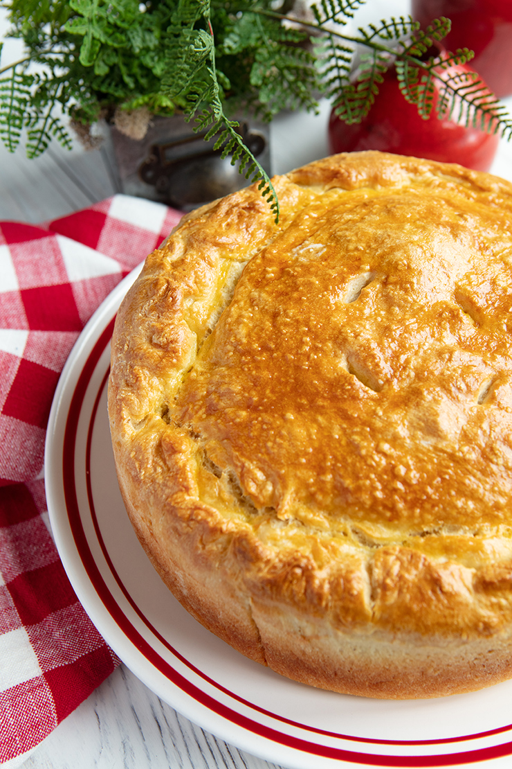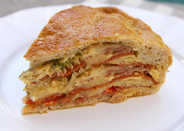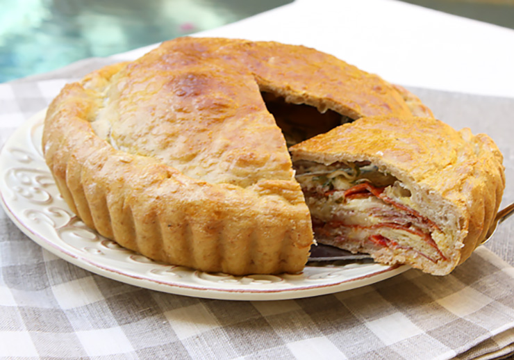 Questa gustosa torta è tradizionalmente fatta il Venerdì Santo per essere mangiata la Domenica di Pasqua o per essere portata durante la tradizionale Pasquetta, o picnic del Lunedì di Pasqua ed è fatta per celebrare la fine della Quaresima. La torta può essere fatta in una teglia rettangolare da 38 cm o in una padella a molla da 25,4 cm, e anche se preferisco che sia servita a temperatura ambiente da sola, potresti offrire un po’ di salsa di pomodoro sul lato per immergerla, se preferisci. Ho usato affettati di carne e formaggio, ma potresti usare anche cubetti di carne e formaggio al posto delle fette. Se si desidera semplificare le cose ancora di più, si potrebbe anche acquistare pasta per pizza preconfezionata al posto di fare la propria. Non facevo questa specialità pasquale da anni, e dopo averla fatta quest’anno mi sono ricordato quanto sia davvero deliziosa e ho intenzione di farcela durante l’estate per fare i bagagli per i picnic. Pizza Chena viaggia alla grande, e una fetta di buone dimensioni è un pasto completo!