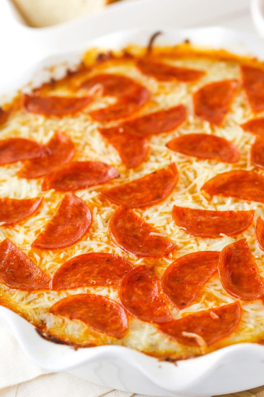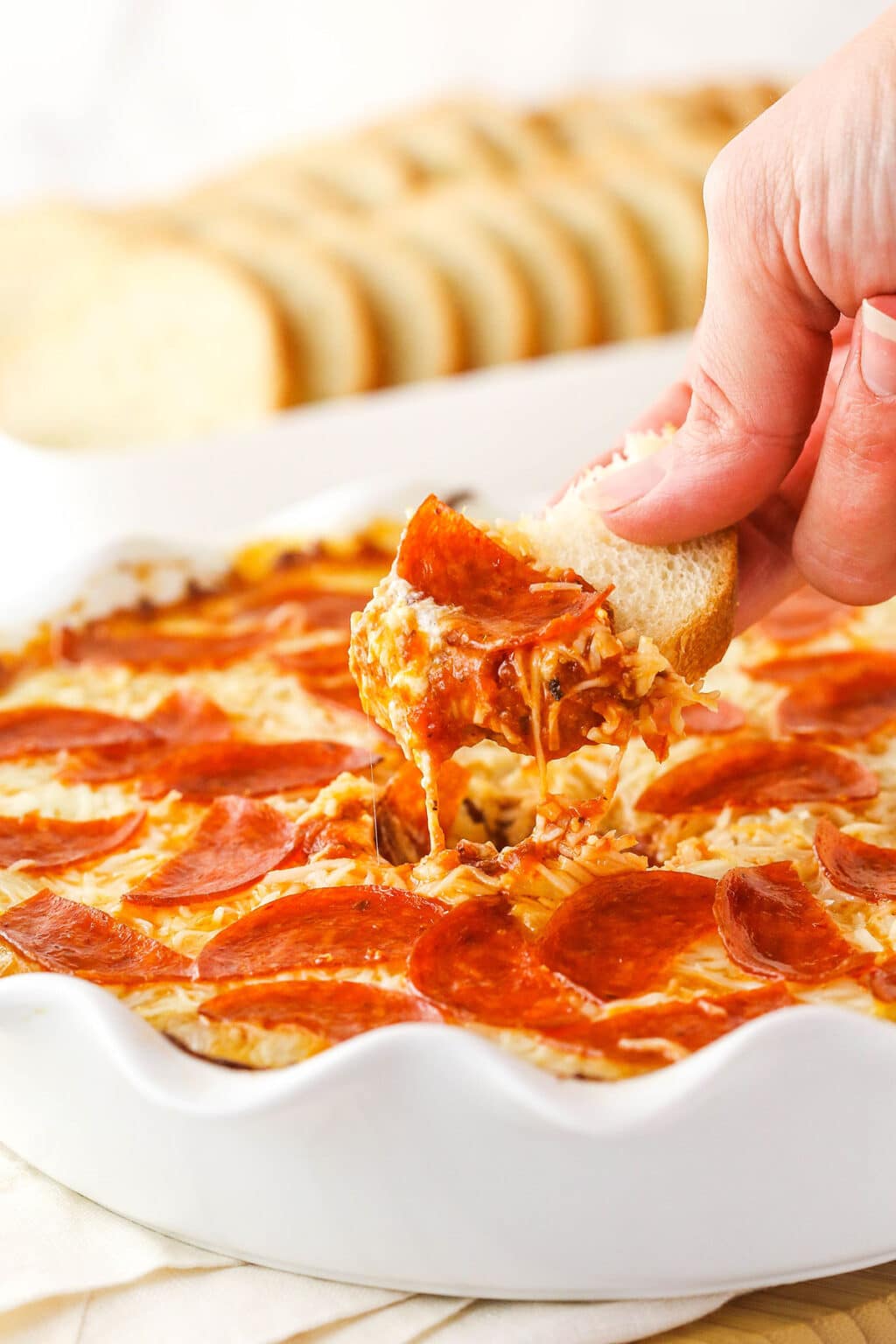 Quasi tutti amano la pizza e questa salsa decadente ha tutto il fascino della pizza in un antipasto confortante e esagerato fatto per inzuppare pane all’aglio, patatine pita, verdure crude, salatini…praticamente qualsiasi cosa! La base è fatta con abbondante panna acida e crema di formaggio, quindi sai che sarà buono. Da lì, include tutti gli elementi gustosi di una buona pizza ai peperoni: due tipi di formaggio, salsa rossa e fette di peperoni.