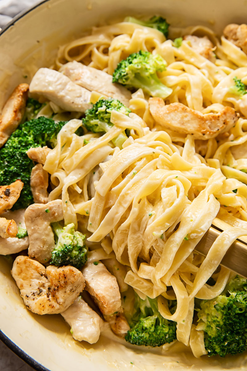 Non ti piace quando puoi unire la comodità di una cena in padella e il lusso delle fettuccine Alfredo?! Aggiungendo i bocconcini di petto di pollo e i broccoli all’amato piatto di pasta si ottiene proprio questo!