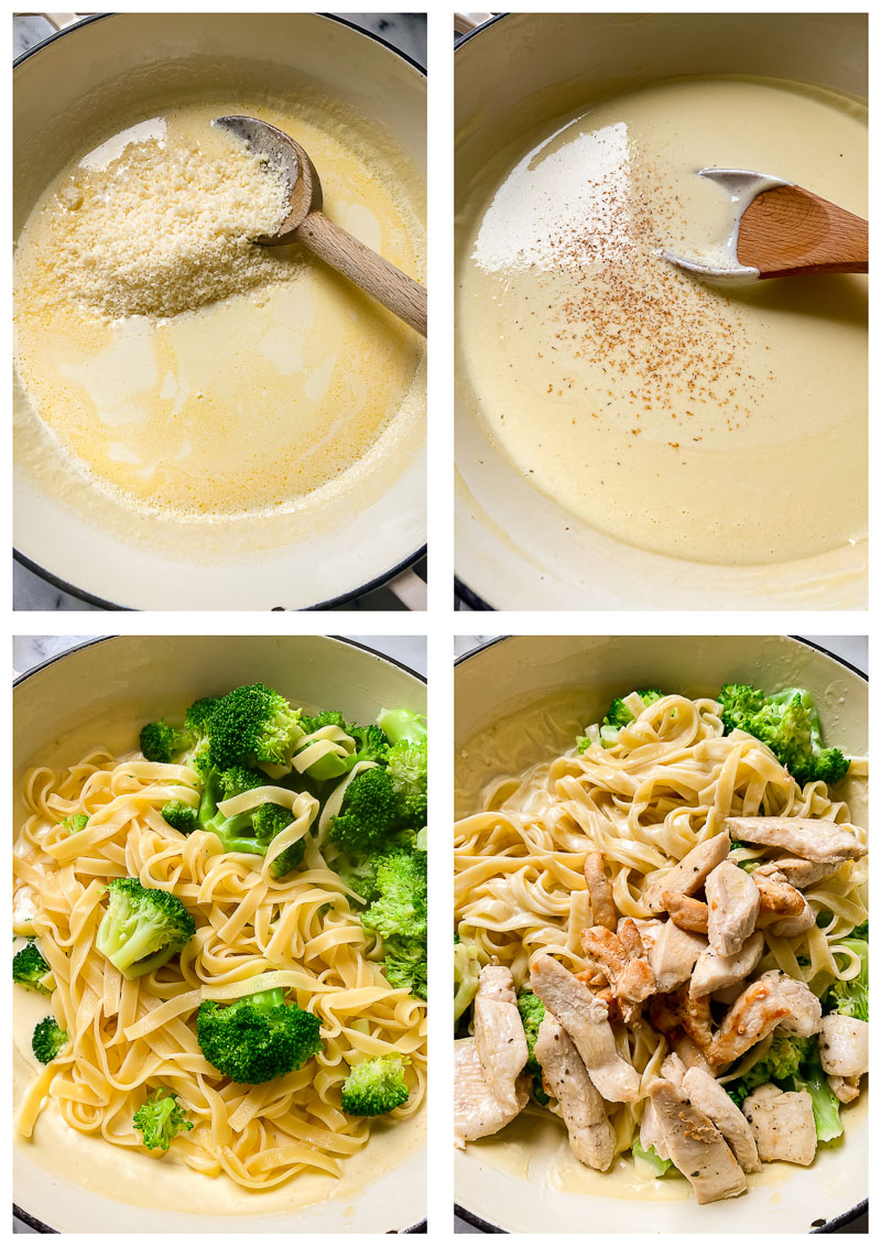 Tuttavia, oggi tiriamo fuori i pezzi grossi e mescoliamo il nostro pollo e la pasta con il famoso sugo Alfredo. Ho anche aggiunto dei broccoli cotti velocemente per una cena soddisfacente in padella, ma si potrebbero aggiungere altre verdure.
