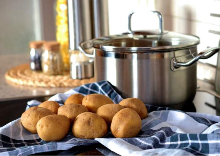 Nel frattempo, fate cuocere le patate intere con la buccia in abbondante acqua. Una volta cotte, sbucciatele e tagliatele a dadini dopo averle fatte raffreddare.