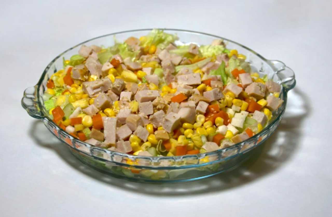 Dopo un’ora, potete servire questa deliziosa insalata. Posizionate alcuni pezzi di lattuga come base nel piatto e aggiungete l’insalata di pollo al mais e patate sopra.