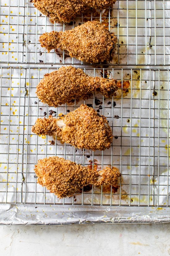 Comincio rimuovendo la pelle e ricoprendo il pollo con un cereale schiacciato e condito come fiocchi di crusca. La chiave per ottenere il pollo croccante è posizionare una griglia di raffreddamento a filo sopra una teglia rivestita di alluminio. In questo modo l’aria calda può circolare sotto il pollo per garantire che cuocia in modo uniforme e che il rivestimento non si inzuppi a causa del sugo di pollo.