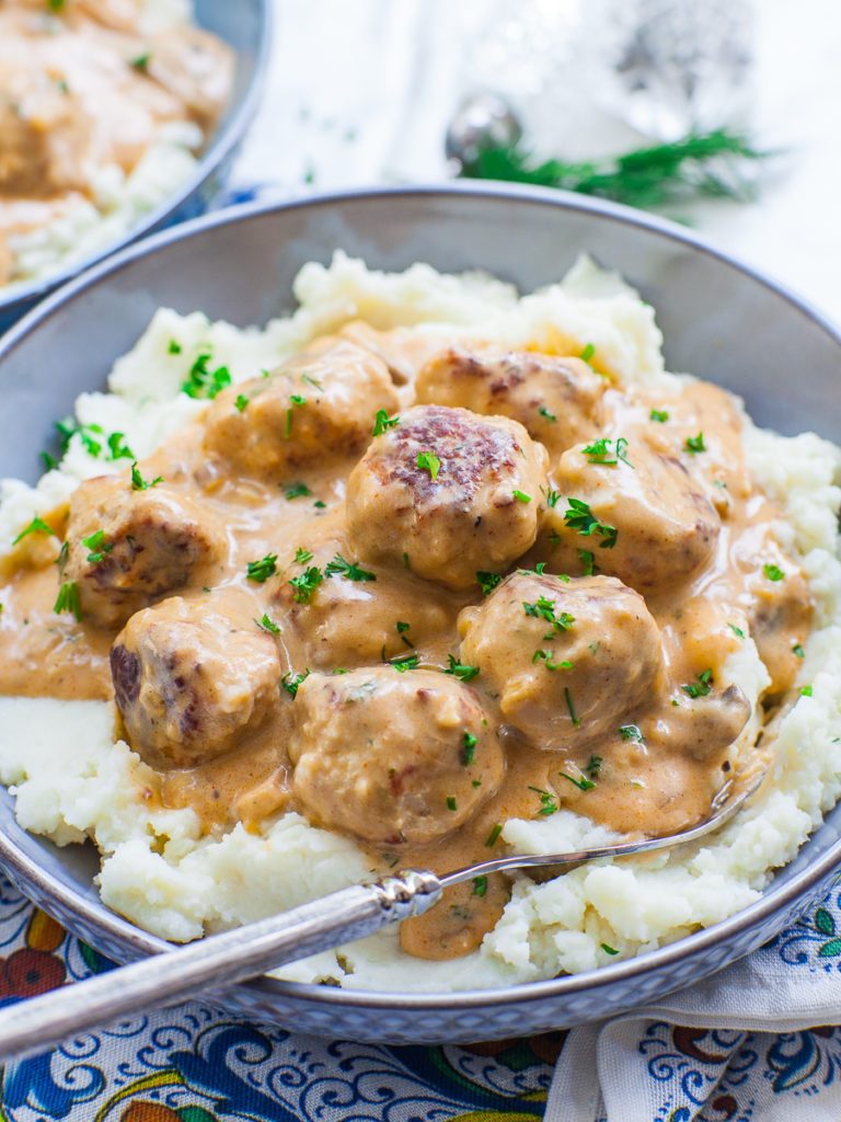 Incredibili polpette di tacchino preparate in un sugo cremoso di funghi, servite su un letto di purè di patate!