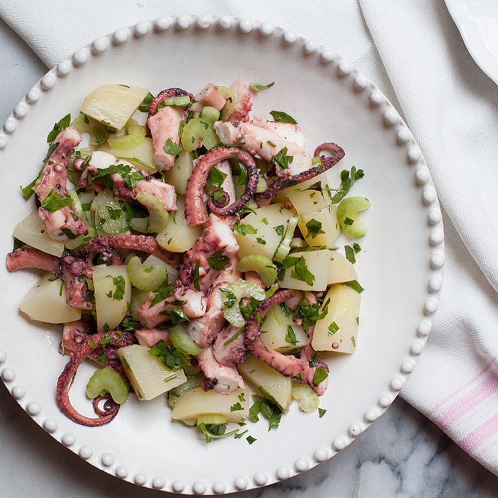 Scongelate i polpi. Sbucciate l’aglio e tritatelo finemente. Sciacquate il prezzemolo e tritatelo. In una salsiera mescolate olio, aglio, prezzemolo e peperoncino (io ne metto ½ cucchiaino) e lasciatelo insaporire. Sciacquate i polpi e metteteli in una pentola insieme alla carota, al sedano ed alla cipolla. Ricopriteli d’acqua e lessateli per 40 minuti circa dall’inizio del bollore (controllate la cottura con una forchetta). Fateli intiepidire nell’acqua di cottura. Scolate i polpi e lasciateli asciugare, poi tagliateli a pezzi e conditeli con l’olio aromatizzato. Salate secondo i vostri gusti (non esagerate con il sale perché la carne del polpo è saporita di suo). Sciacquate le patate e lessatele intere e con la buccia. Sbucciatele, tagliatele a pezzi ed unitele al polpo mescolandole. Servite il polpo con patate tiepido o freddo. Consigliamo di preparare l’olio aromatizzato almeno 2 ore prima in modo che s’insaporisca per bene. Ovviamente il piatto può essere realizzato utilizzando anche dei polpi freschi che però dovranno essere sfibrati battendoli; un metodo alternativo per intenerirli consiste nel metterli nel congelatore per un paio di ore in modo che il formarsi dei cristalli di ghiaccio sfibri la carne.