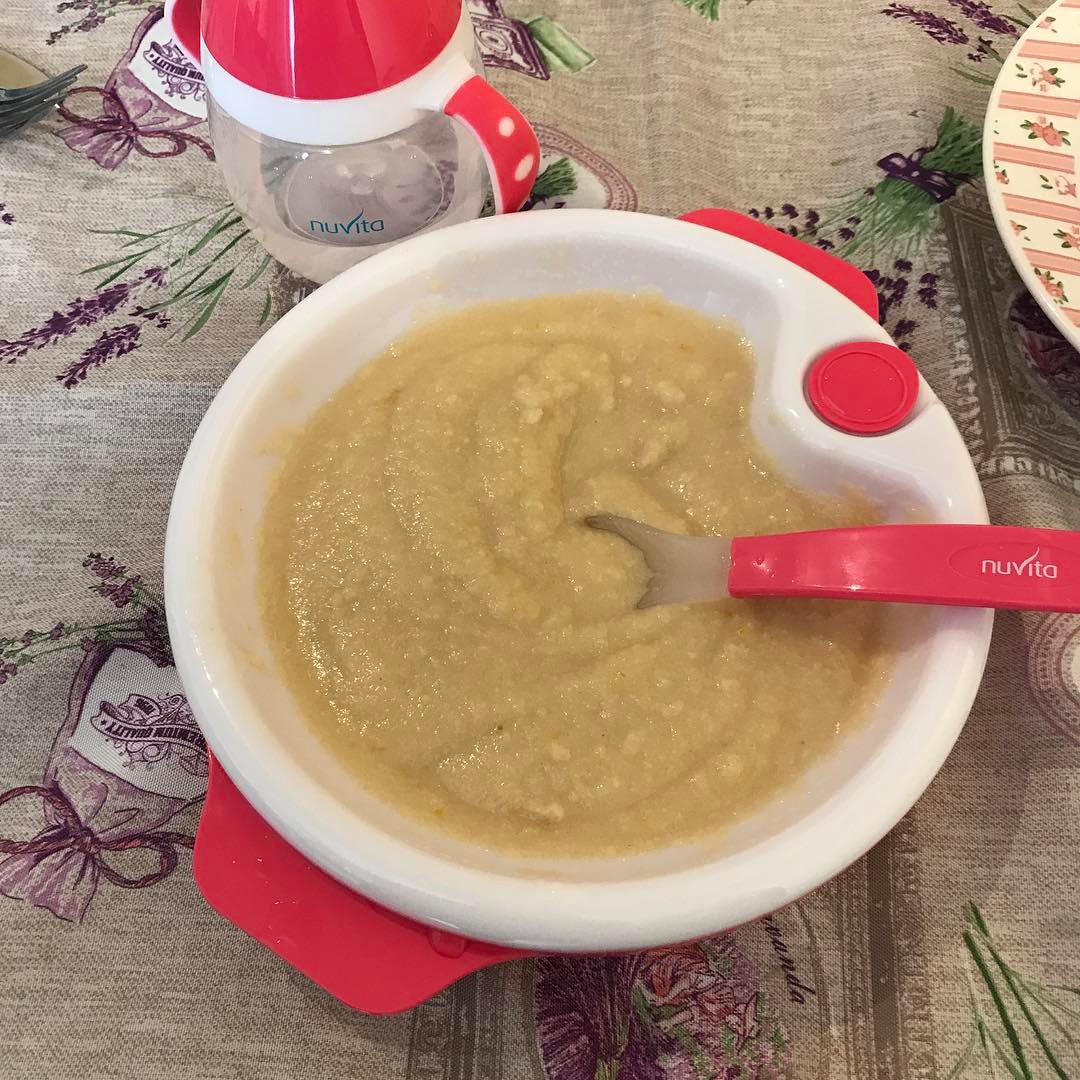 Aggiungere gradualmente al brodo caldo tutti gli ingredienti e mescolare fino a che la pappa non risulti morbida e cremosa. Una volta che il bambino si è abituato, si può aggiungere al brodo vegetale anche qualche cucchiaino di verdure passate o schiacciate con la forchetta.