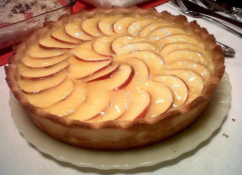 Para massa: Preaqueça o forno a 180ºC. Em uma tigela grande, misture a farinha de trigo e o sal. Em seguida, adicione a manteiga e a gema de ovo, e amasse bem com as mãos até obter uma massa lisa e homogênea. Polvilhe um pouco de farinha sobre uma superfície lisa e enfarinhada. Transfira a massa e abra-a sobre a superfície com um rolo de massas (cerca de 1 cm de espessura). Em seguida, transfira a massa para uma forma redonda de fundo removível com 25 cm de diâmetro, forrando todo o fundo e 2 terços da lateral. Leve ao forno por 20 minutos até que a massa esteja dourada e crocante. Para creme: Em uma panela, adicione o leite condensado, 1 e ½ lata de leite e as gemas já peneiradas. Misture bem com a ajuda de um batedor. Leve ao fogo médio para engrossar. Quando estiver quase fervendo, acrescente o amido de milho diluído no restante do leite, mexendo vigorosamente para não empelotar, até engrossar. Retire do fogo e reserve. Para doce: Em uma frigideira de fundo grosso, adicione o açúcar e leve ao fogo baixo. Quando o açúcar começar a derreter e adquirir a cor de caramelo, adicione a água fervente e mexa bem até dissolver todo o açúcar. Logo em seguida, adicione as fatias de maçã e mexa cuidadosamente para caramelizá-las. Cozinhe por 2 ou 3 minutos e desligue o fogo. Para montagem: Em cima da massa já assada despeje o creme e acerte bem para não ficar desigual. Em seguida, arrume as fatias de maçã cuidadosamente sobre o creme e leve à geladeira por no mínimo 4 horas antes de servir.