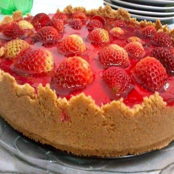 Em primeiro lugar faça a gelatina conforme o modo de preparo, e deixe-a na geladeira porque na hora do uso ela deve estar em ponto de clara de ovo pois se estiver líquida, a gelatina penetrará na massa. Depois faça o creme, junte todos os ingredientes e mexa até levantar fervura e você ver que ele está bem cremoso, cuidado para não deixar empelotar ou grudar no fundo da panela, mexa bastante sem parar. Na hora do uso ele deve estar já frio ou levemente morno. Agora faça a massa junte todos os ingredientes e quando ela estiver no ponto forre um pirex de médio a grande, os mais fundos são melhores. fure a massa com um garfo e asse em fogo médio entre 10 a 15 minutos, quando dourar está boa, cuidado para não deixar queimar pois a massa fica fina. Montagem de torta: Massa assada no pirex, deixe esfriar um pouco. Coloque o creme. Os morangos cortados na transversal, coloque eles sobre todo o creme. Agora coloque a gelatina já em ponto de clara, assim ela ficará na superfície. Levar à geladeira por no mínimo 4 horas.