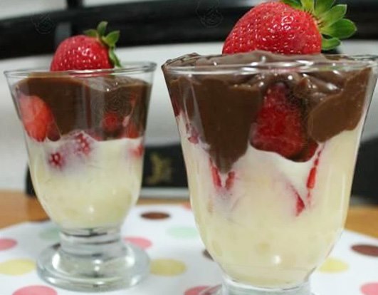 Misturar e coloque no microondas por 1 minuto, Retirar e mexa. Coloque mais uma vez no microondas, por 30 segundos, Retirar e mexa, até derreter bem. Despeje a cobertura por cima dos morangos e leve à geladeira, coberta por papel filme. Na hora de servir, você pode decorar com morangos ou com cereja.