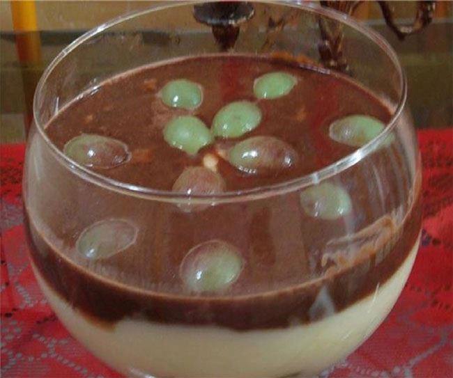 Em seguida despeje esse creme branco em um refratário e espere esfriar. Quando o creme branco estiver frio, coloque sobre ele uma camada de uvas inteiras ou, se preferir, morangos. Para o creme preto: Derreta o chocolate meio amargo e o chocolate ao leite, no no microondas ou em banho-maria.