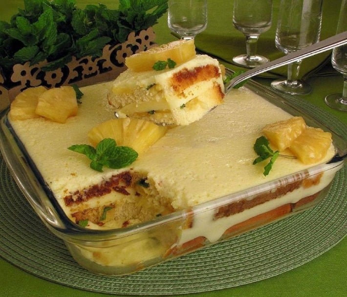 Bata no liquidificador o leite condensado com o creme de leite até formar um creme. Misture a gelatina de abacaxi com a água quente até dissolver. Junte ao creme do liquidificador e bata por mais 1 minuto. Despeje em uma vasilha e leve à geladeira por 30 minutos ou até que endureça um pouco. Para a montagem, em um refratário médio, faça camadas do creme de abacaxi, do bolo umedecido na calda reservada e do abacaxi misturado com a hortelã picada, acabando em creme. Leve à geladeira por 3 horas ou até firmar. Decore com alguns pedaços de abacaxi e com folhas de hortelã e sirva.