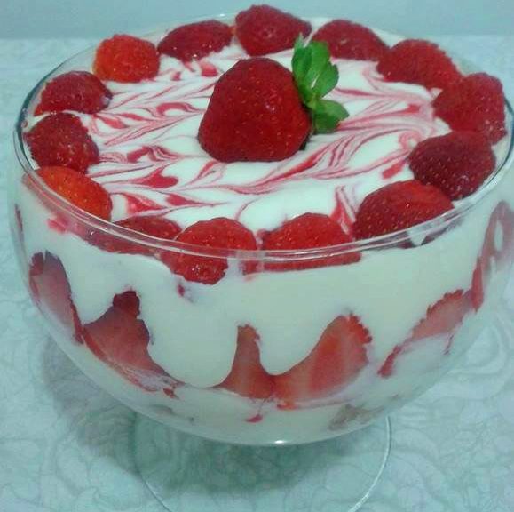 Para creme amarelo: Levar ao fogo todos os ingredientes (diluir antes a maizena com o leite), mexendo bem e sempre, para não empelotar. Quando engrossar, retirar do fogo e colocar em um refratário. Para creme branco: Bater as claras em neve. Acrescentar o açúcar e bater no final, misturar o creme de leite com uma colher. Espalhar sobre o creme amarelo já frio no refratário picar os morangos e espalhar sobre o creme de claras. Para cobertura: Derreter as barras de chocolate e após misturar o creme de leite. Espalhar sobre os morangos. Decorar com morangos.