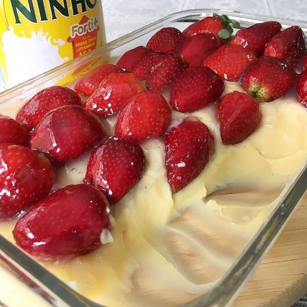 Misture a gema com o amido de milho mexa bem, adicione todos os ingredientes na panela (menos os morangos) em fogo baixo, e mexa até ficar um creme bem liso, demora uns 10 minutos. Depois desligue o fogo e deixe esfriar. Depois de frio coloque o creme em uma travessa pequena e coloque os morangos inteiros ou picados por cima, deixe gelar por 5 minutos e sirva!
