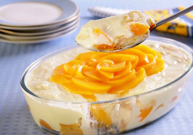 Coloque os pêssegos em uma peneira para escorrer a calda. Reserve ambos (a fruta e a calda). Em uma panela média, coloque o leite com o leite condensado, as gemas e o amido, misture bem e leve ao fogo, mexendo sempre até engrossar. Deixe esfriar e mexa às vezes. Reserve 2 metades de pêssego e pique o restante. Em um refratário, monte o pavê alternando camadas de biscoitos levemente umedecidos na calda reservada, creme e pêssego picado. Finalize com o creme. Decore com o pêssego reservado, cortado em tirinhas, e leve à geladeira por 2 horas antes de servir.