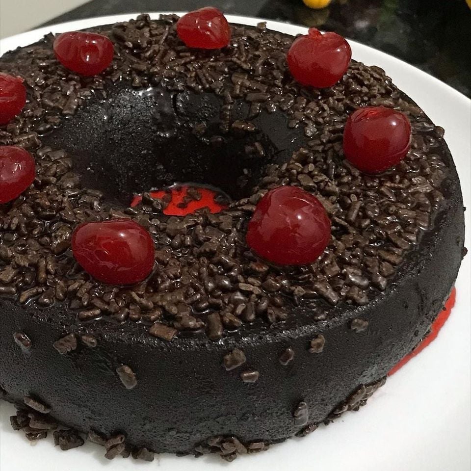 Bata tudo no liquidificador. Se quiser peneirar as gemas pra evitar cheiro de ovo, pode viu? Despeje numa forma untada com manteiga e leve ao banho maria que você já tiver costume. Deixe esfriar bem e coloque por uma horinha na geladeira, desenforme, coloque granulado e algumas cerejas pra decorar.