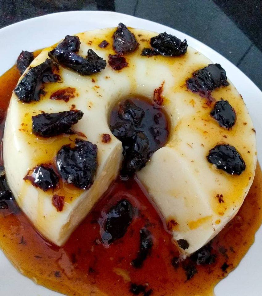 Para manjar: Dissolva o amido no leite, misture os outros ingredientes e leve ao fogo mexendo sempre até engrossar. Depois mexa em fogo baixo por mais dois minutos, para não ficar com gosto forte de amido. Coloque em uma forma untada com óleo e leve pra geladeira de um dia pro outro, ou por no mínimo 3 horas. Para calda: Leve o açúcar ao fogo baixo, mexendo sempre até derreter por completo, em seguida vá pingando aos poucos a calda da lata da ameixa e mexendo até que fique numa consciência um pouco mais rala que mel. Coloque as ameixas, misture e desligue. Agora é só desenformar o manjar e jogar a calda fria por cima.