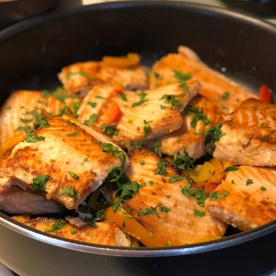 Pique o filet de salmão e tempere a gosto. Eu usei o tempero pronto de alho , ervas finas ,sal e um pouquinho de pimenta defumada. Leve a uma frigideira antiaderente em fogo médio. Ele vai começar a soltar o óleo aí eu tampo de deixo cozinhar. Depois viro e deixo cozinhar do outro lado. Tiro a tampa e acrescento pimentões coloridos. Deixo por mais 5 min ou até o pimentão murchar. Desligo o fogo e adiciono o cheiro verde a gosto. Usei coentro. Prontinho, super fácil e rápido.