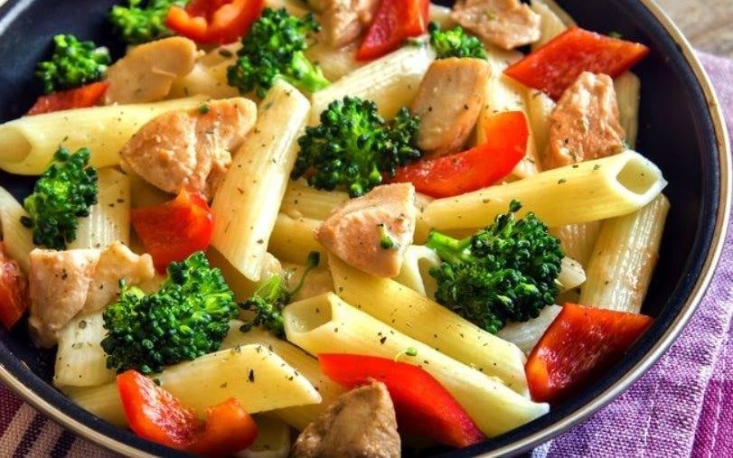 Preparar o macarrão conforme as instruções da embalagem e reservar. – Cortar os filés de frango em tiras, temperar com sal e pimenta a gosto e reservar. Cortar o pimentão e reservar. Aferventar os brócolis em um pouco de água e sal, escorrer e reservar. Em uma panela, colocar o azeite, dourar o alho e fritar as tiras de frango até dourar. Acrescentar os pimentões, os brócolis e refogar por alguns minutos. Acertar o sal e a pimenta. Colocar em uma travessa e finalizar com a salsa a gosto.