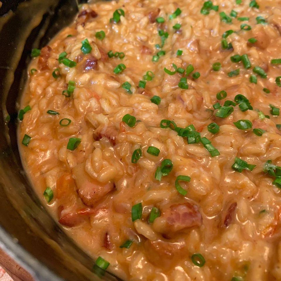 Numa panela coloque o bacon pra fritar. Não deixe ficar fritinho demais senão resseca viu? Deixe ele suculento. Retire toda gordura que soltar. Não jogue essa gordura do bacon fora, refogue seu arroz e feijão amanhã com ele. Coloque de uma vez a cebola e alho (eu coloquei pimenta de cheiro tbm). Mexa bem até a cebola murchar um pouco. Sempre observando para não deixar nada passar demais. Esse processo de colocar as coisas é bem uma atrás da outra, então já deixe todo pré preparo pronto pq é bem rápido. Coloque o tomate e mexa. Em seguida já pode colocar o arroz. Mexa bem e deixe o arroz dar uma leve fritada. Em seguida, já vai colocando o caldo. Para o caldo pegue algumas verduras da geladeira como: batata, cenoura, alho, cebola, tomate e pimenta de cheiro. Pique tudo grosseiro (o alho partir uma cabeça ao meio) coloque tudo na água e deixe ir apurando no fogo baixo. Vá mexendo e colocando esse caldo aos poucos até o arroz cozinhar. Coloque caldo, mexa, quando ele estiver secando, coloque novamente. Faça esse processo até ficar no ponto que vc deseja. Cuidado pra não ir colocando caldo demais e depois ficar um risoto aguado. Finalize com bastante queijo sempre e se quiser colocar uma colher de sopa generosa de manteiga bem decente e gelada, fica perfeito tbm!