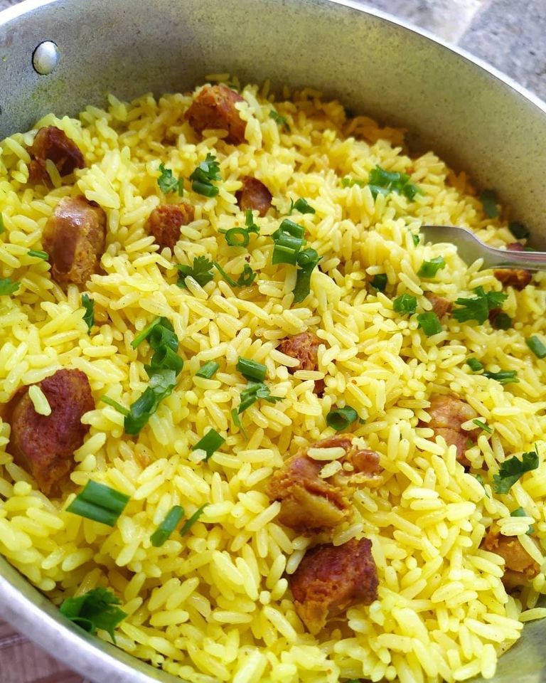 Numa panela faça o arroz branco normal do dia a dia. Capriche nos temperos como alho e cebola, açafrão, cozinhe e reserve. Numa outra panela, frite bacon e calabresa em cubinhos. Não deixe fritar muito para não ressecar. Retire um pouco da gordura! Estando fritos, acrescente pimenta do reino e mexa beeeeem! Depois coloque bastante salsinha! Salsinha vai dar vida e sabor pro arroz, acredite! Fica perfeito e lindo.. Depois desse processo, vá colocando colheradas do arroz que vc cozinhou a parte nessa panela e vá mexendo. Coloque aos poucos e vá mexendo!