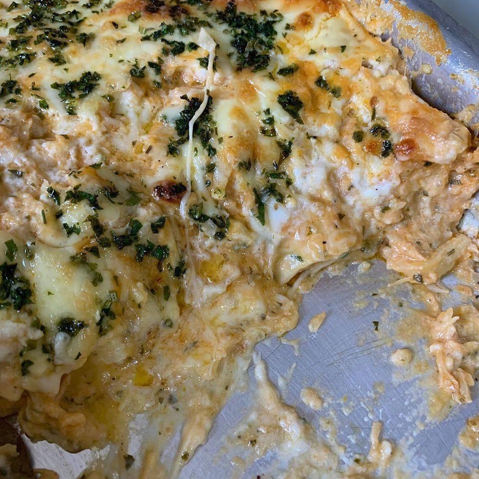 Numa panela refogue com bastante azeite a cebola, salsinha e alho. Em seguida, coloque o frango. Deixe refogar bem! E em seguida já coloque sal e cominho! Continuei refogando! Em seguida, bata alguns tomates maduros sem casca e coloque essa batida no molho. Mas vc pode usar molho de tomate de saquinho normalmente! Deixe cozinhando bem até dar uma bela encorpada no molho. Quando sentir que encorpou um pouco, coloque requeijão cremoso e deixe refogando mais. Ajuste os temperos e reserve. Faça o molho branco caprichado. Coloque na panela 1 colher de sopa de manteiga bem generosa, cebola picadinha e deixe refogar. Depois 1.1/2 colher de sopa de farinha bem generosa tbm mexendo até aquela farinha cozinhar. Acrescente 500 ml de leite e rale uma noz moscada e vá mexendo até engrossar! Para montagem: Numa forma coloque um pouco dos dois molhos embaixo, depois massa fresca depois muzarela e repita esse processo até o fim! Leve para assar a forno 250 graus por uns 30 min!
