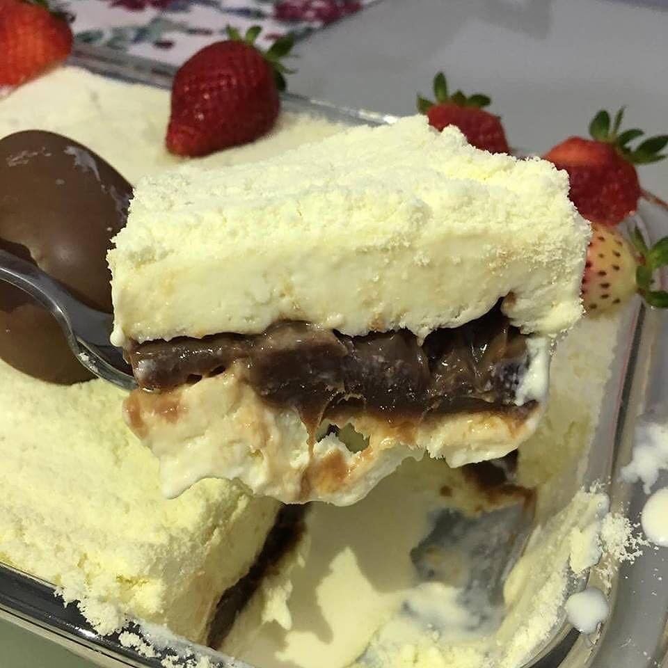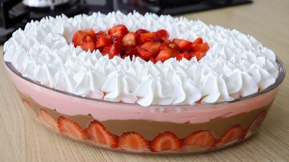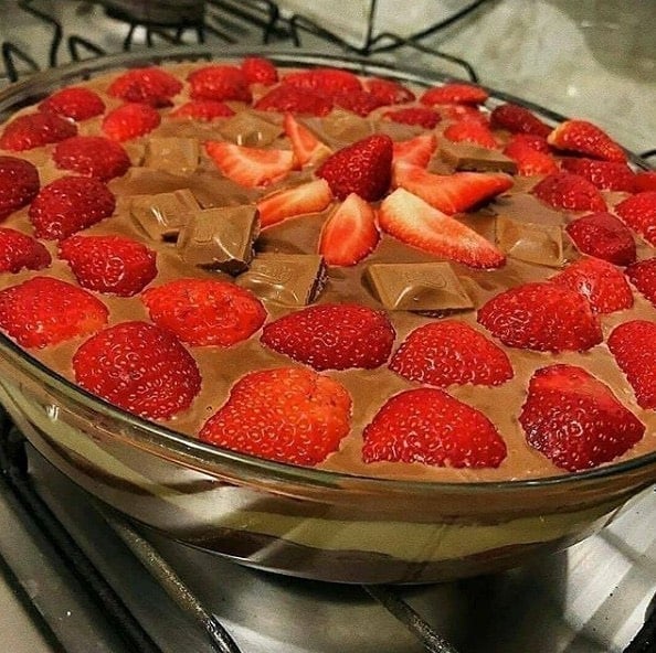 Leve à geladeira por, no mínimo, 2 horas antes de servir. Para o chantilly dar ponto mais rápido, coloque a tigela da batedeira dentro de uma bacia com gelo! Depois que colocar uma camada fina de creme, decore toda a lateral da travessa com morangos picados. Vai ficar lindo, como na foto!