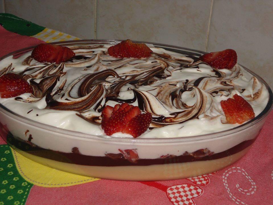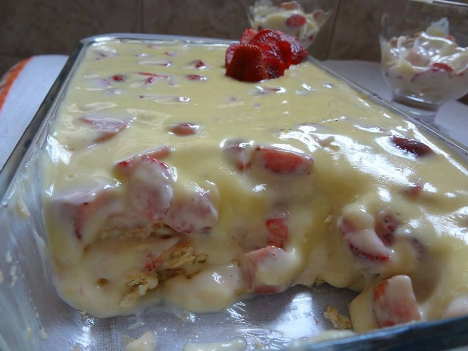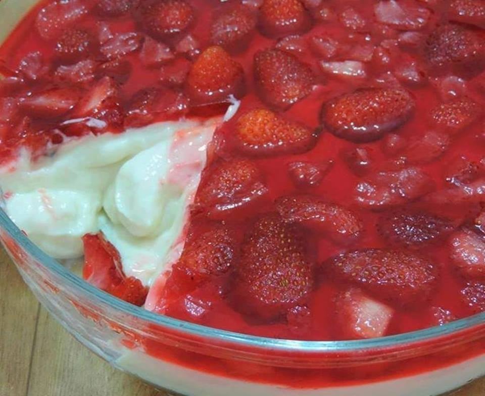 Quando creme estiver pronto deixe esfriar por alguns minutos e adicione o creme de leite. Despeje o creme em uma forma. Corte os morangos ao meio e monte em cima do creme. Prepare a gelatina com menos água 150 ml de água fervente e 150 ml de água fria. Despeje a gelatina em cima dos morangos. Leve à geladeira até endurecer a gelatina.Pode colocar biscoito, vai ficar parecido com um pavê.