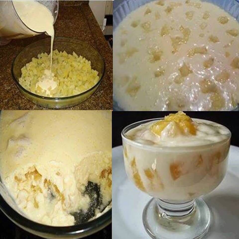 Descasque o abacaxi e corte em cubinhos coloque em uma panela com a água e açúcar e deixe ferver por uns 15 minutos. Retirar o abacaxi da água e reserve. Na água que foi fervido o abacaxi dissolver a gelatina em pó, espere esfriar e bata no liquidificador com o creme de leite e o leite condensado até formar um creme. Coloque o creme sobre o abacaxi em um refratário. Leve a geladeira por aproximadamente 2 horas ou até o creme endurecer e sirva-se. Você pode deixar alguns pedaços de abacaxi para dar um toque especial.
