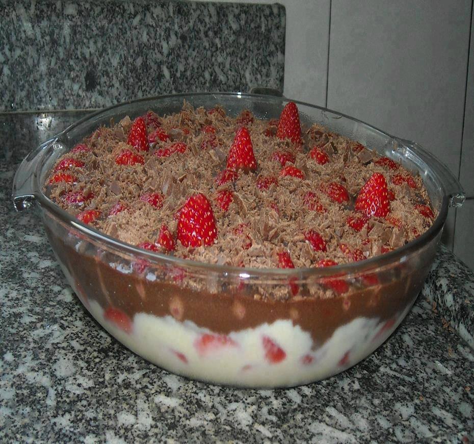 Colocar a outra caixa de morangos picados, se quiser raspe uma barrinha de 50g do chocolate por cima para decorar.