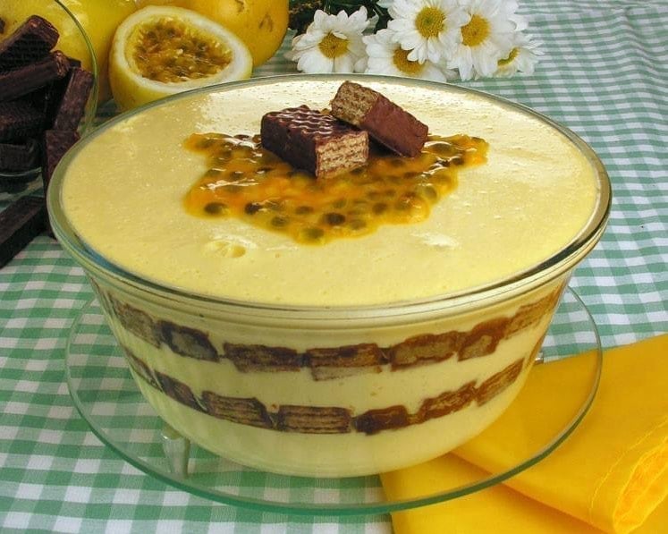 Bata no liquidificador a gelatina com a água fervente para dissolver. Junte os demais ingredientes, menos o Bis, e bata por 2 minutos. Em um refratário pequeno, intercale camadas de creme de maracujá e de Bis picado, terminando em creme. Decore com Bis picado e polpa de maracujá. Leve à geladeira por 3 horas. Você também pode substituir o bis, por bombom sonho de valsa ou ouro branco.