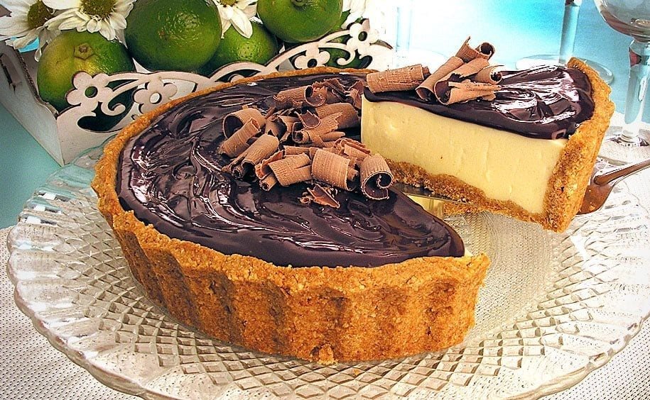 Triture os biscoitos no liquidificador, adicione a manteiga e misture até obter uma farofa úmida. Com ela, forre o fundo e a lateral de uma fôrma de 26cm de diâmetro de aro removível. Leve ao forno médio, preaquecido, por 10 minutos. Reserve. Para o recheio, no liquidificador, bata o leite condensado, o suco de limão, a gelatina preparada conforme as instruções da embalagem e o creme de leite até homogeneizar. Despeje esse creme sobre a massa da torta e leve à geladeira por 1 hora. Para a cobertura, derreta o chocolate em banho-maria ou no micro-ondas e misture o creme de leite. Espalhe sobre o creme de limão, decore com raspas de chocolate e leve à geladeira por 2 horas antes de desenformar e servir.