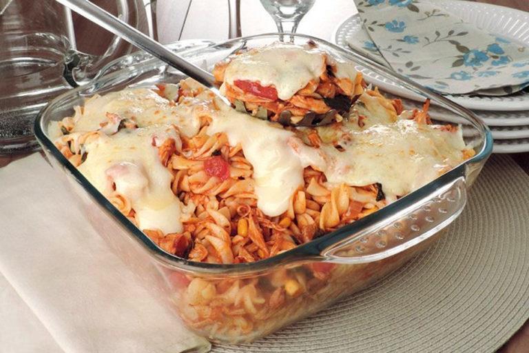 Cozinhe o macarrão em uma panela com água fervente e sal conforme o tempo indicado na embalagem ou até ficar al dente. Escorra e reserve. Aqueça uma panela com o azeite, em fogo médio, e frite a cebola e o alho por 3 minutos. Adicione o frango, o milho, o tomate, o molho e cozinhe por 5 minutos. Tempere com sal e pimenta. Misture com o macarrão, o manjericão e despeje em um refratário grande. Cubra com o requeijão, às colheradas, e polvilhe com a mussarela. Leve ao forno alto, preaquecido, por 10 minutos ou até gratinar. Retire do forno e está pronto. Só servir.