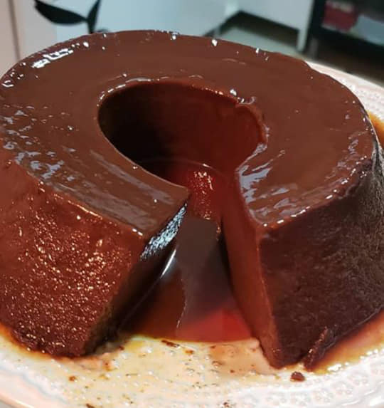 Numa forma própria para pudim (a minha mede 22 centímetros) coloque o açúcar e leve ao fogo baixo mexendo de vez em qdo até o açúcar derreter por completo e virar o caramelo. Reserve. Pessoal, eu não costumo colocar água no meu caramelo, mas vcs podem fazer do jeitinho que já estão acostumadas, tá bom? No liquidificador coloque todos os ingredientes do pudim e bata por uns 2 minutinhos. Despeje na forma que tava reservada, cubra com papel alumínio e leve ao forno em banho Maria. Asse na temperatura de 180 graus por 1 hora e meia. Depois leve pra geladeira por umas 3 horas ou até que esfrie por completo. Depois é só desenformar e pronto. Ah, antes de virar o pudim no prato é bom se certificar que ele está realmente soltinho da forma tá bom? Se precisar passe cuidadosamente uma faquinha nas laterais. Vcs tbm podem levar a forma na boca do fogão e deixar por uns 15 segundos. Assim a calda vai amolecer e o pudim soltar com mais facilidade. Eu usei o chocolate da mavalério 32% se vocês forem usar um mais forte eu acho interessante diminuir quantidade. Com achocolatado acho que fica um pouco enjoativo, por isso não recomendo muito. Na receitinha original tava dizendo 45 minutos de forno, porém o meu eu preferi deixar por 1 hora e meia. Pingue umas gotas de limão ou vinagre na forma do banho Maria, assim evita dela escurecer.