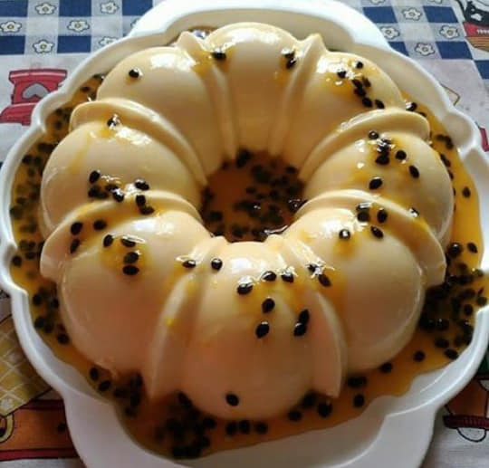 Para pudim: Ferva o leite. Dissolva a gelatina de maracujá no leite quente. No liquidificador, bata a gelatina dissolvida no leite quente, o leite condensado e o creme de leite, durante 3 minutos. Despeje a mistura em uma forma de buraco central untada com algumas gotas de óleo. Leve à geladeira de um dia para o outro. No dia seguinte, desenforme, cubra com a calda de maracujá e sirva. Para calda: Em uma panela, misture a polpa do maracujá, a água e o açúcar. Deixe ferver por cerca de 3 minutos e desligue. Espere esfriar e cubra o pudim.