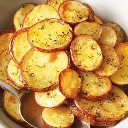 Pré-aqueça o forno a 190. Em uma tigela, misture as batatas com o azeite de oliva, alho, raspas de limão e orégano. Tempere bem. Arrume as fatias de batata em uma única camada em uma assadeira. Asse no forno por 35 minutos ou até ficar dourada.
