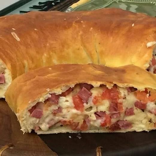 Deixe-a descansar por 30 minutos. Pique a calabresa e o queijo. Abra a massa com o rolo e acrescente a calabresa e queijo. Tudo em um lado da massa. Corte tiras no outro lado da massa e enrole como um rocambole. Passe a gema de ovo por cima e orégano. Asse por 30 minutos a 180º C.