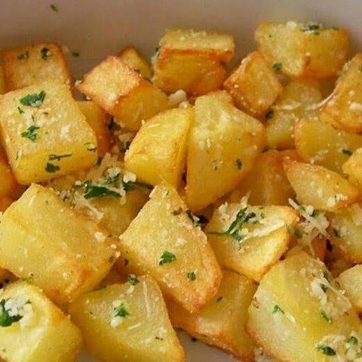 Em uma panela com água fervente e salgada escalde as batatas por 3 minutos, escorra e seque-as. Aqueça o óleo até ficar bem quente, salteie as batatas mexendo de vez em quando para que fique dourada de todos os lados. Junte o resto dos ingredientes. Enquanto mexe continue salteando até que estejam douradas. Bom apetite.