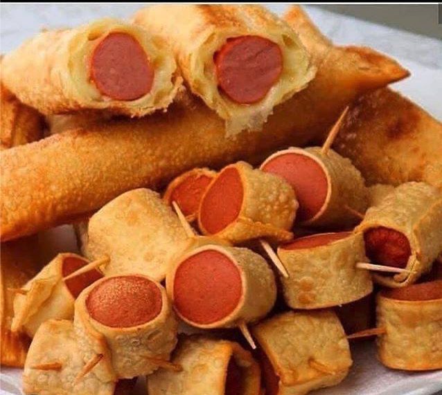 Corte quadrados da massa de pastel do tamanho da salsicha. Não se esqueça de tirar o plástico. Em seguida, coloque uma fatia de queijo prato no centro do quadrado da massa e em uma das pontas, coloque a salsicha e enrole. Retire o excesso de massa que sobrou nas pontas com uma faca. Para finalizar, pincele os enroladinhos com óleo e leve ao forno até dourar.