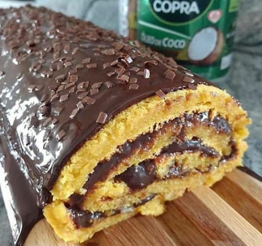 Para o bolo o massa: Junte as farinhas, a goma e o fermento. Reserve. Bata no liquidificador as gemas, a cenoura, o óleo de coco e o açúcar, se necessário coloque um pouco de leite para ajudar a bater ou água. Reserve, e bata as claras em neve. Leve para uma tigela os líquidos do liquidificador e os secos, incorpore tudo e por fim incorpore as claras em neve delicadamente. Espalhe a massa numa assadeira de 40 cm que deve estar untada e coberta com papel manteiga também untado. Leve ao forno 180 graus em uma forma de 25 centímetros untada por 25-30 minutos. Espere esfriar. Para brigadeiro: Misture o leite, o chocolate em pó e o açúcar em fogo médio mexendo até engrossar. Coloque no bolo e enrole. Cubra com chocolate derretido ou brigadeiro.