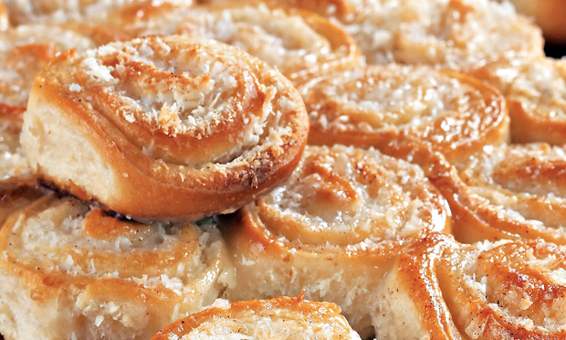 Dissolva o fermento na água com o açúcar, misturando os outros ingredientes aos poucos e por último o sal. Mexa bastante com as mãos até obter uma massa lisa e boa de trabalhar (modelar), até soltar das mãos. Divida a massa em pedaços. Abra individualmente, com rolo de massa, no comprimento. Disponha a mistura do recheio com a ajuda de uma colher. Enrole, para ficar um rolo grande e corte em pequenos rolinhos. Faça isso até finalizar a massa e o recheio. À medida que for cortando os rolinhos, coloque-os em forma de qualquer formato, untada com óleo. Deixe descansar por no mínimo 1 hora. Depois leve ao forno, em temperatura média (220ºC) até que fique assado.