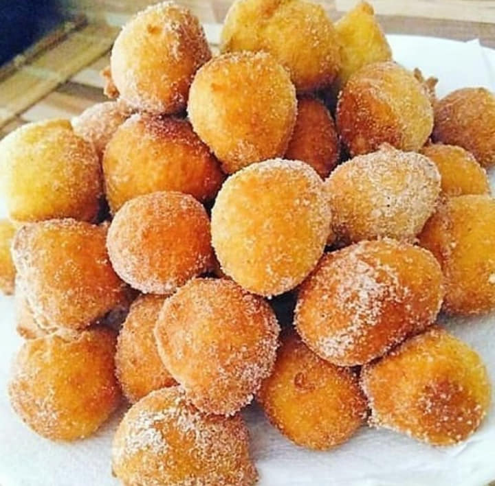 Misturo bem o ovo, o açúcar e o sal primeiro. Depois acrescento o restante dos ingredientes e misturo bem também tudo com a colher mesmo. Depois só ir pegando um pouco da massa com a colher e colocando no óleo pra fritar. Por último passei eles no açúcar refinado misturado com canela em pó (opcional). O óleo não pode estar muito quente para que o bolinho não fique cru por dentro, nem tão frio pra que ele não fique encharcado de óleo. Algumas pessoas dizem que fica ótimo colocar leite condensado por cima pra comer. Bom vai de cada um.