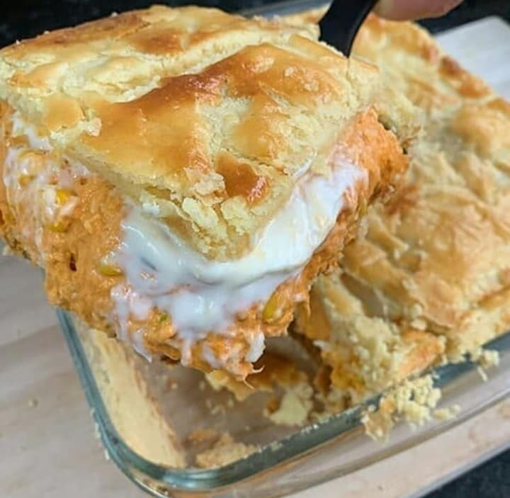 Adicione o frango + 1/2 potinho de requeijão por cima e espalhe. Coloque o outro pedaço de massa por cima e pincele um ovo. Asse em forno pré aquecido a 180° C por 40 minutos.