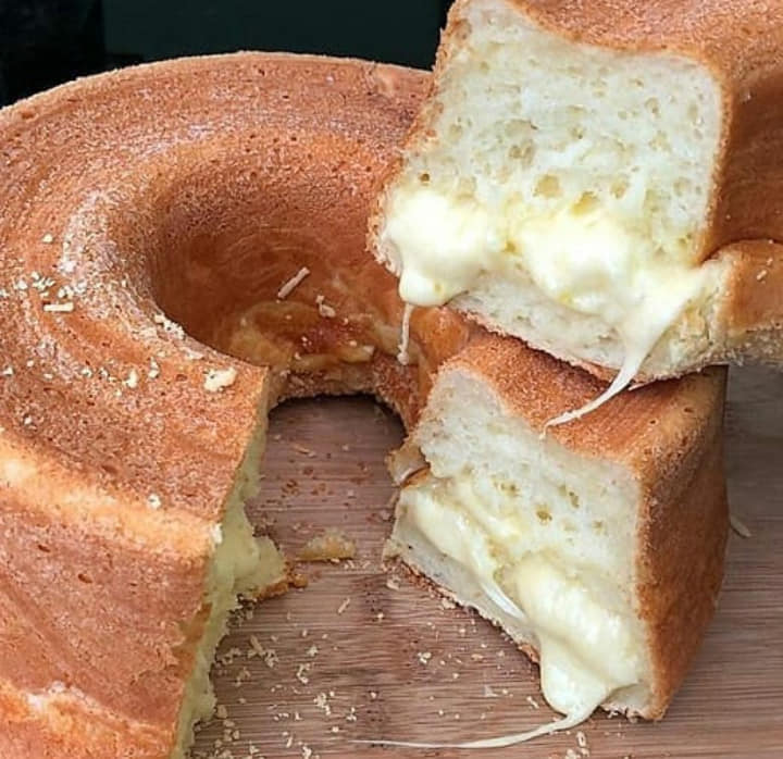 Bata no liquidificador por 2 minutos. Unte uma forma com furo no meio e adicione metade da massa, recheie com 200 g de muçarela ou queijo minas, despeje o restante de massa e polvilhe queijo parmesão, asse em forno pré-aquecido a 180°C por 30 minutos.
