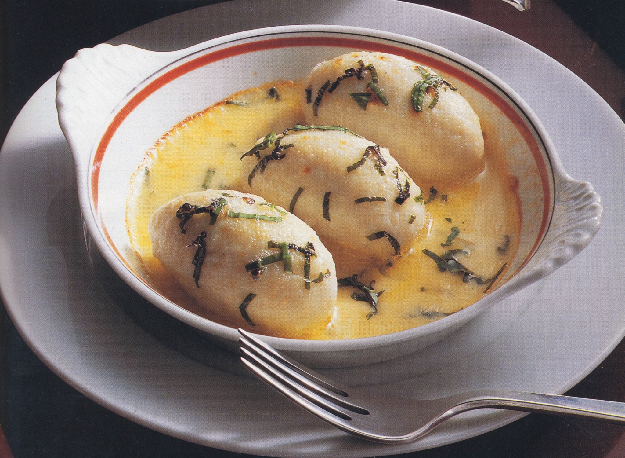 Tagliare a pezzi il filetto di luccioperca e raffreddarlo bene insieme alla panna. Salare, pepare e passarlo attraverso il disco sottile del tritacarne. Metterlo in una ciotola immersa nel ghiaccio e mescolarlo bene con la metà della panna. Passare il composto nel mixer, ma non troppo per evitare che si riscaldi, poi passarlo nel setaccio a maglia sottile, aiutandosi con una spatola, per eliminare gli ultimi residui delle lische. Mettere nuovamente una ciotola nel ghiaccio e incorporare il resto della panna, fino a quando la farcitura sia bella liscia. Condire con sale e pepe. Unire la panna leggermente montata. Formare dalla farcitura 12 gnocchi di forma ovale, aiutandosi con due cucchiai bagnati in acqua fredda, e portarli a cottura in acqua salata in ebollizioni in 10 minuti. Per la salsa: sbucciare gli scalogni e tagliarli a fette. Metterli con il vino bianco e il Noilly Prat in una casseruola e portare a bollore. Versare il fondo di pesce e farlo ridurre di 1/3.Åggiungerela panna e far sbollire fino a quando la salsa si sia addensata e abbia raggiunto la consistenza voluta. Passarla a setaccio fine. Condire con sale, pepe e succo di limone. Sbattere a parte, in una piccola ciotola, l’uovo con due cucchiai di salsa senza più cuocere. Aggiungere i pezzi di burro e frullare brevemente con il frullatore ad immersione. Unire i filetti di aglio orsino. Imburrare 4 stampi monoporzione. Scolare con una schiumarola gli gnocchi, farli sgocciolare bene e disporne tre ogni stampo. Versare la salsa sugli gnocchi. Gratinare brevemente sotto il grill preriscaldato.