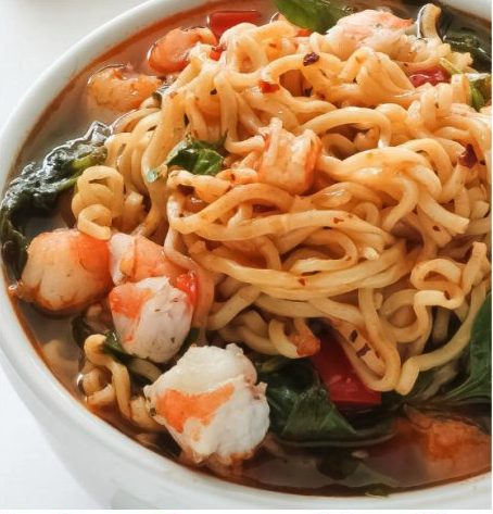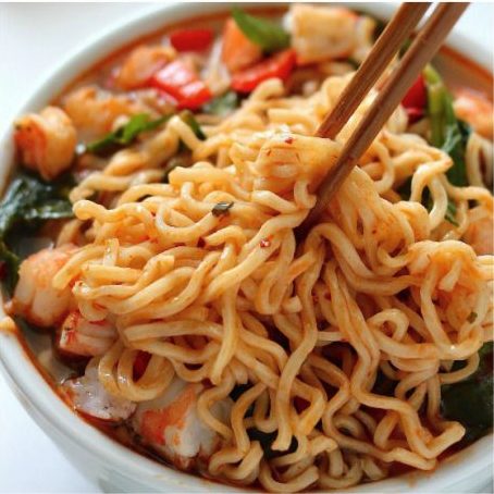 - Aggiungere i ramen secchi al brodo e cuocere per 2 minuti, mescolando se necessario. Mescolare i gamberi tritati, gli spinaci e il succo di limone, mescolando bene per unire prima di togliere la padella dal fuoco. Assaggiate il brodo e aggiustate le spezie secondo necessità. Versate la zuppa nelle ciotole e servite subito.