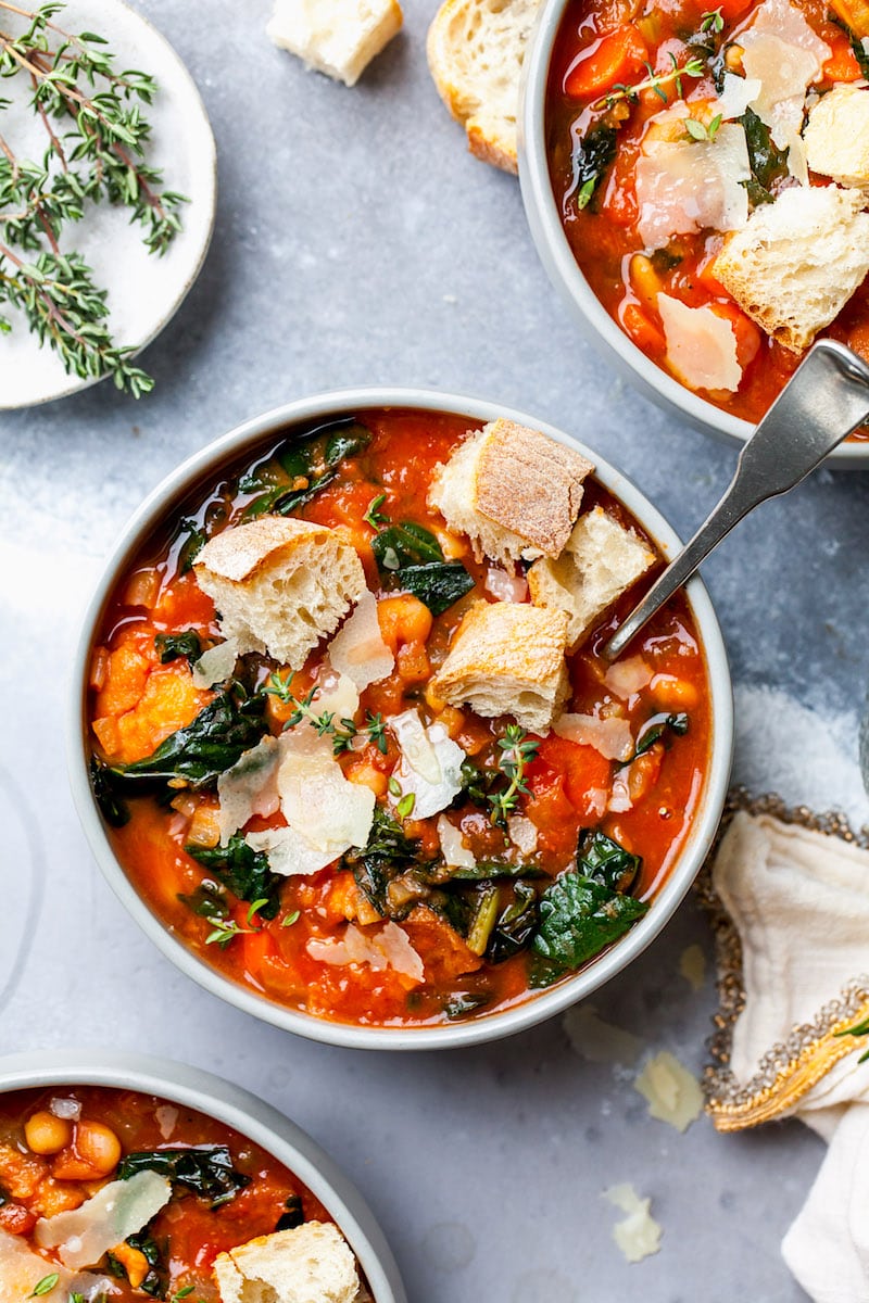 È un tipico piatto della tradizione toscana, di cui si trovano diverse varianti. Cominciate con il preparare una buona zuppa di fagioli: lasciateli prima in ammollo per almeno 12 ore, quindi scolateli e lessateli in acqua rinnovata, a fuoco basso e pentola coperta. Nel frattempo insaporite in un tegame con dell’olio la cipolla, la carota, il sedano affettati e l’aglio schiacciato; unite anche i pomodori spellati (che avrete sbollentato per un attimo in acqua bollente), il peperoncino e un pizzico di timo e, dopo almeno 5 minuti di cottura, anche la patata tagliata a dadini e la verza sottilmente affettata. Cuocete quindi a fiamma bassa aggiungendo poca acqua; unite anche i fagioli lessati e passati al passaverdura insieme con la loro acqua di cottura. Per non rendere duri i legumi, aggiustate di sale soltanto poco prima di ritirare dal fuoco, dopo circa 20 minuti di cottura. Nel frattempo disponete in un capace tegame di coccio due strati di sottili fette di pane e quindi versatevi sopra la zuppa. Fate altri due strati di pane e coprite ancora con la minestra. A questo punto avrete ottenuto un’ottima zuppa. La ribollita vera e propria si potrà preparare il giorno dopo, quando metterete il tegame a fuoco bassissimo, aggiungerete nel centro, facendo un foro, dell’olio extravergine d’oliva e farete bollire molto lentamente.