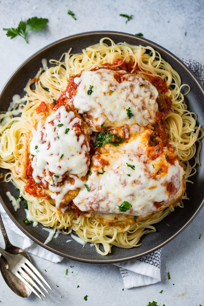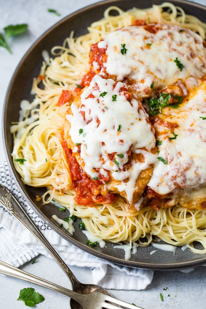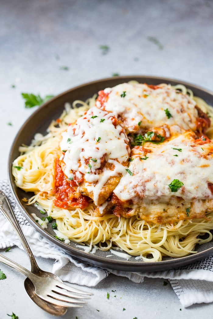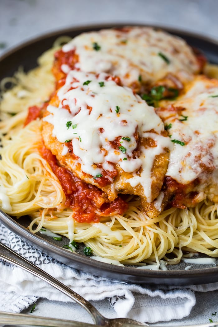 Servi il tuo parmigiano di pollo veloce e facile sugli spaghetti, oppure preferiamo i noodles con capelli d’angelo con un po’ di salsa in più sui noodles. Ci piace anche guarnire con un po’ di pollo al parmigiano, grazie al nome e una spolverata di prezzemolo tritato italiano per rallegrare le cose.